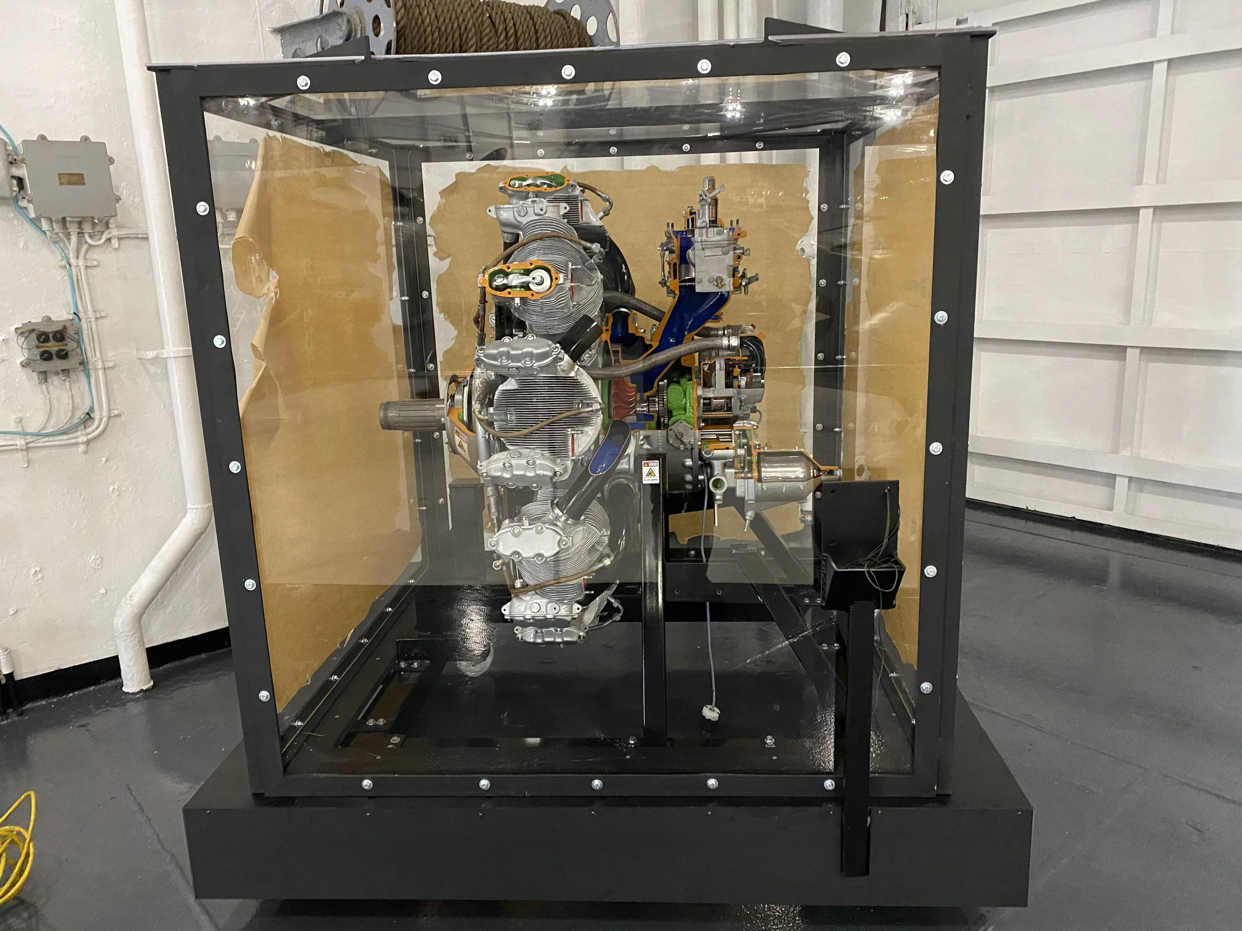Above is a custom welded aluminum frame with 1/2” clear polycarbonate that was built to house this open faced plane motor. It has special lighting and a motor to turn the engine slowly.